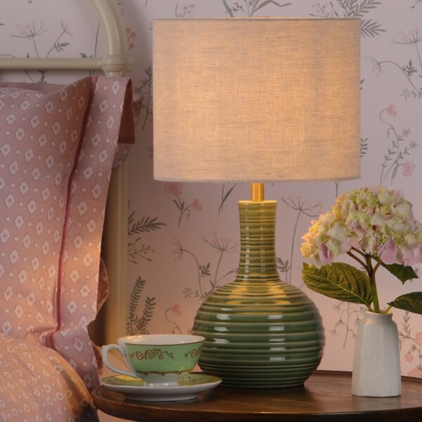 This lovely table lamp Padley comes from the Laura Ashley collection. The lamp features a rippled ceramic base in glossy transparent glaze in deep green. The lamp is paired with oatmeal fabric shade which creates a nice warm glow of light. The Padley lamp is suitable for both modern and traditional interiors. FEATURES: * Table lamp * Rippled ceramic base in glossy transparent glaze in the deep green * Oatmeal fabric shade * Antique Brass details * Requires 1 lamp * Double insulated * In line rocker switch SIZE: * Height: 45 cm * Diameter: 25 cm * Shade height: 20 cm * Shade diameter: 25 cm BULB: * Requires 1 x Small Edison Screw Candle Lamp LED-NOT INCLUDED
